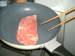 なになに「ステーキは最初に強火で30秒焼くことにより表面のタンパク質が固まり、肉汁の流出が防げる」らしい。あとは弱火で好みの焼き加減にするらしい。オレはレアがいいので弱火で1分。